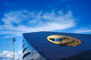تصویری از نمای بیرونی ساختمان با پنلهای خورشیدی گسترده و طراحی مدرن؛ این پروژه یکی از شاخصترین نمونههای ساختمان انرژیمثبت است